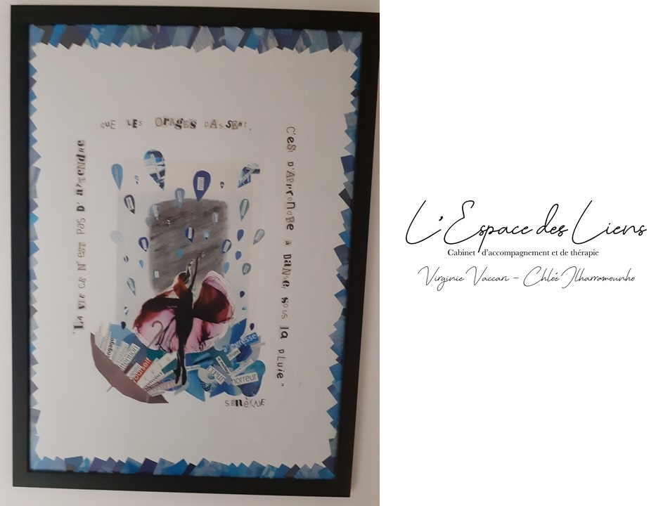 Vous pourrez la retrouver au sein du cabinet et, nous espérons bientôt pouvoir aussi y contempler vos créations (peinture, collage, écriture, dessins, photos, sculpture). Alors, si cela vous tente, rapprochez-vous de votre thérapeute ou contactez-nous !