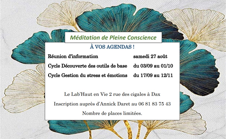 Annick Daret, praticienne en Méditation de Pleine Conscience, vous propose pour cette rentrée une réunion d’information ainsi que des cycles en groupe pour découvrir et pratiquer la Méditation de Pleine Conscience.