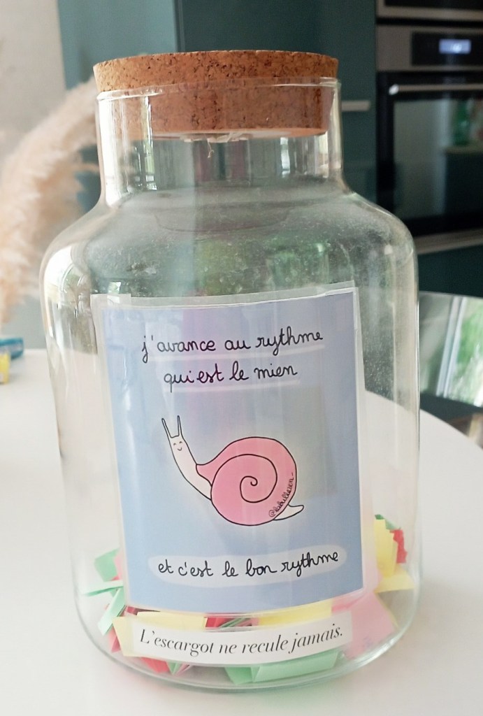 Alors, faire le point, un état des lieux, de temps en temps, s’avère fort utile ! Et c’est ce que nous avons fait mardi. Un début de séance où on se donne des nouvelles, une impression de ne pas avancer, le rappel de l’importance des petits pas qui dérive sur des échanges de sourires et de rires autour de la métaphore d’un escargot qui avance toujours à son rythme et ne recule jamais vue sur les réseaux sociaux, une idée, des papiers multicolores, une paire de ciseaux, des feutres, un saladier trouvé dans un placard, une tasse de rooibos et 1h plus tard il ne restait plus qu’à constater que le saladier était rempli à ras bords de « petits pas » !