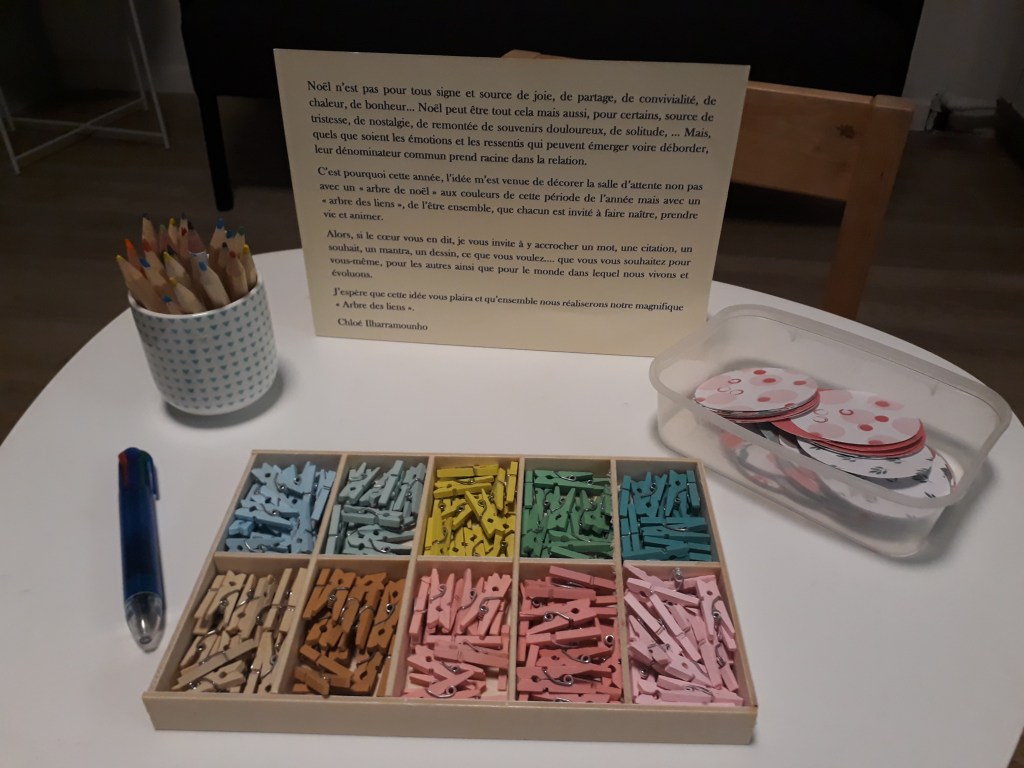 C’est pourquoi cette année, l’idée m’est venue de décorer la salle d’attente non pas avec un « arbre de noël » aux couleurs de cette période de l’année mais avec un « arbre des liens », de l’être ensemble, que chacun est invité à faire naître, prendre vie et animer. Cette idée a germé peu à peu en moi suite à des échanges avec des patients quant à leur vécu de cette période.