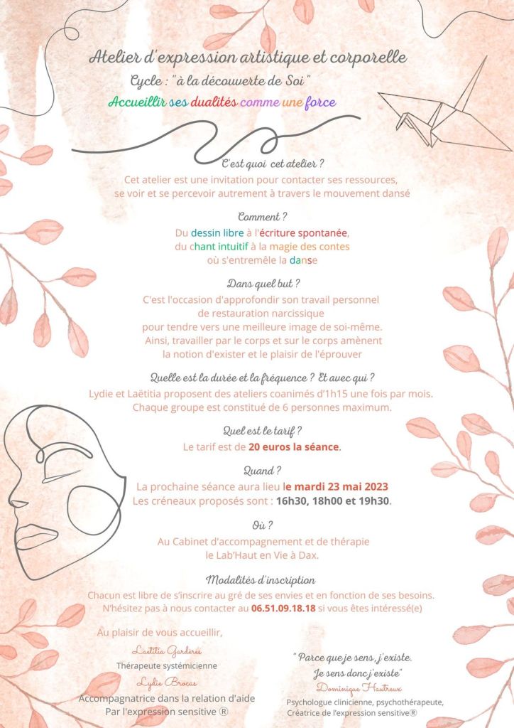 Ma collègue Laëtitia Gardères et Lydie Brocas vous proposent le mardi 23 mai prochain, un atelier d’expression artistique et corporelle à la découverte de soi sur le thème « Accueillir ses dualités comme une force » : à 16h30, 18h et 19h30.
