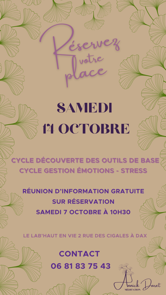 Annick Daret vous propose une réunion d’information sur les cycles de méditation de pleine conscience qu’elle propose au sein du cabinet : cycle de découverte des outils de base et cycle de gestion du stress et des émotions.