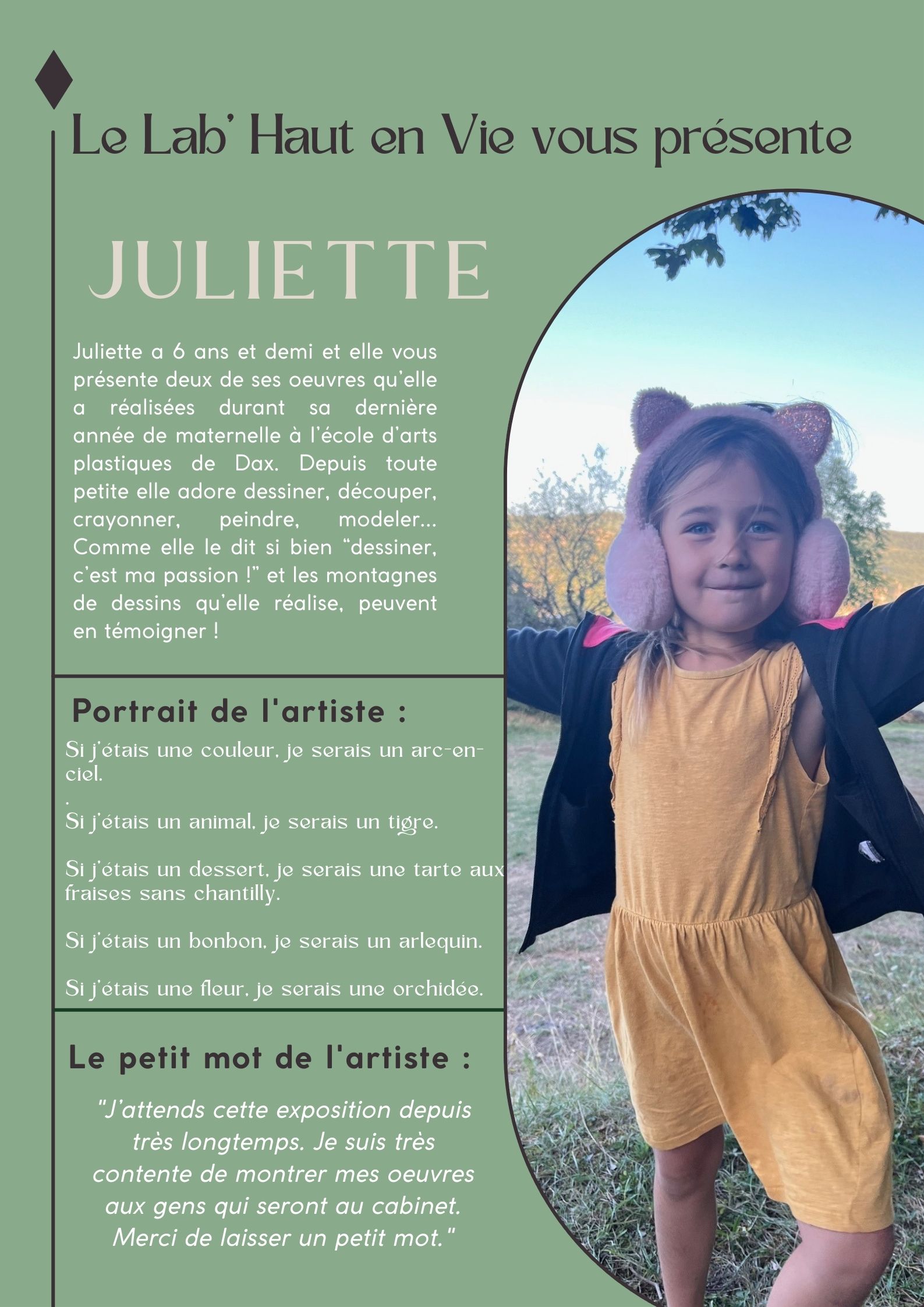 Cette année, la Cabinet Le Lab’ Haut en Vie vous propose l’exposition de deux œuvres que Juliette a choisies parmi les tableaux qu’elle a réalisés l’année dernière lors de sa première année à l’école d’arts plastiques de Dax.