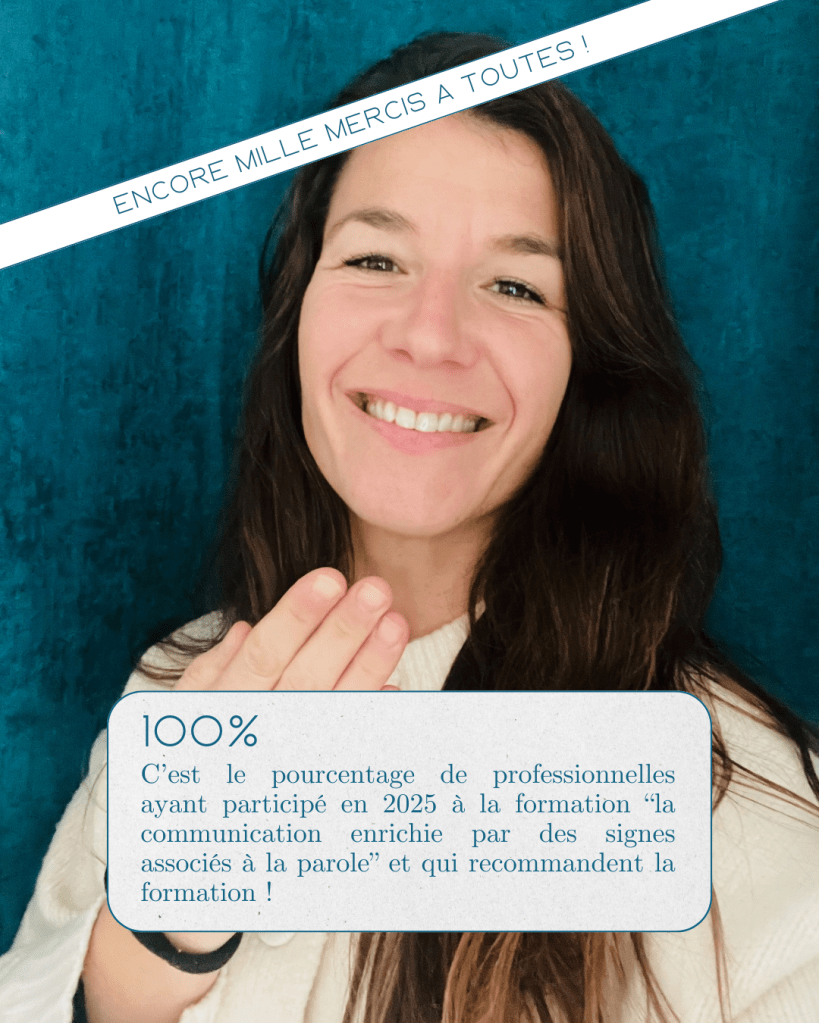 C’est avec une immense joie et beaucoup de gratitude pour toutes les personnes que j’ai rencontrées durant les formations que j’ai animées cette année que je vous partage que 100% des participantes (oui oui, il n’y a eu que des femmes cette année…!) recommandent la formation « la communication enrichie par des signes associés à la parole : outil d’accompagnement bienveillant du jeune enfant ». Quant à vos avis, je n’ai pas de mots, ils sont tous simplement 🤩.