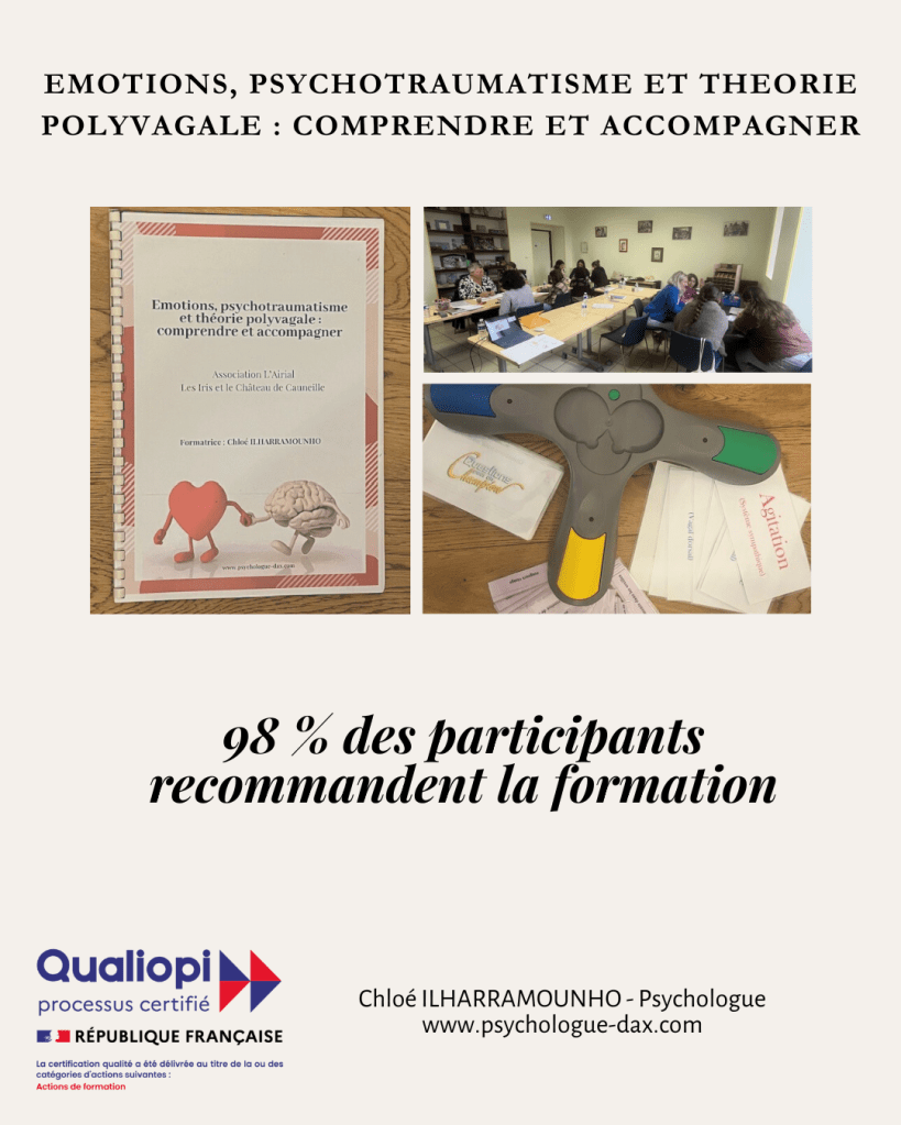 J’ai eu la chance cette année de former la quasi totalité des professionnels du Château de Cauneille et des Iris à Peyrehorade (Association l’Airial) sur le thème « Emotions, psychotraumatisme et théorie polyvagale : comprendre pour accompagner ».