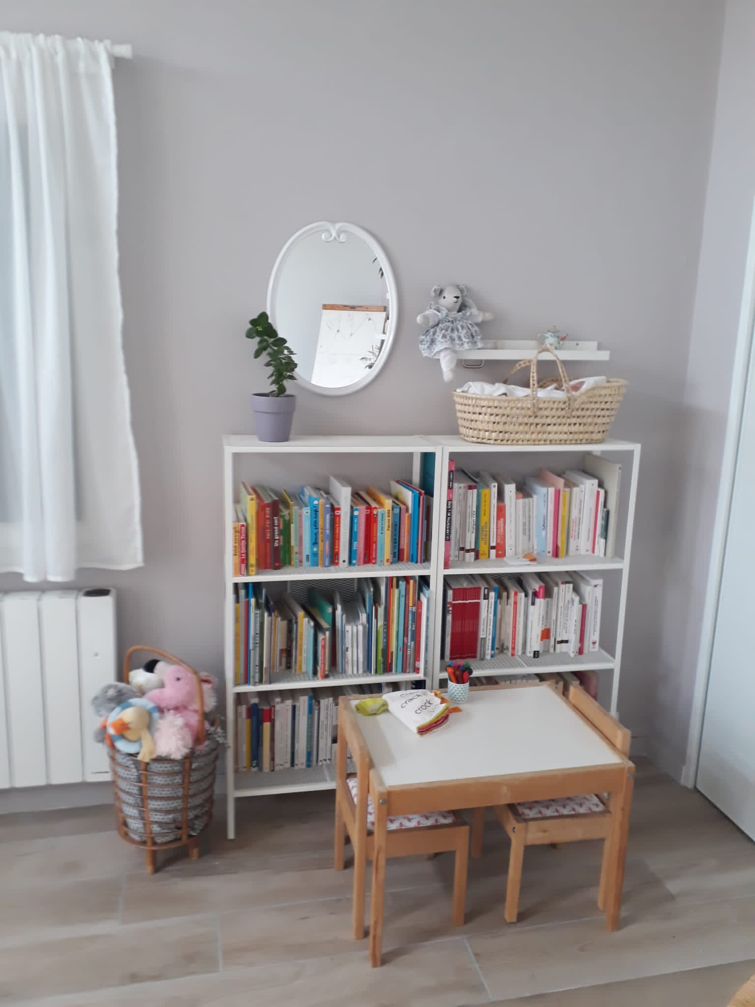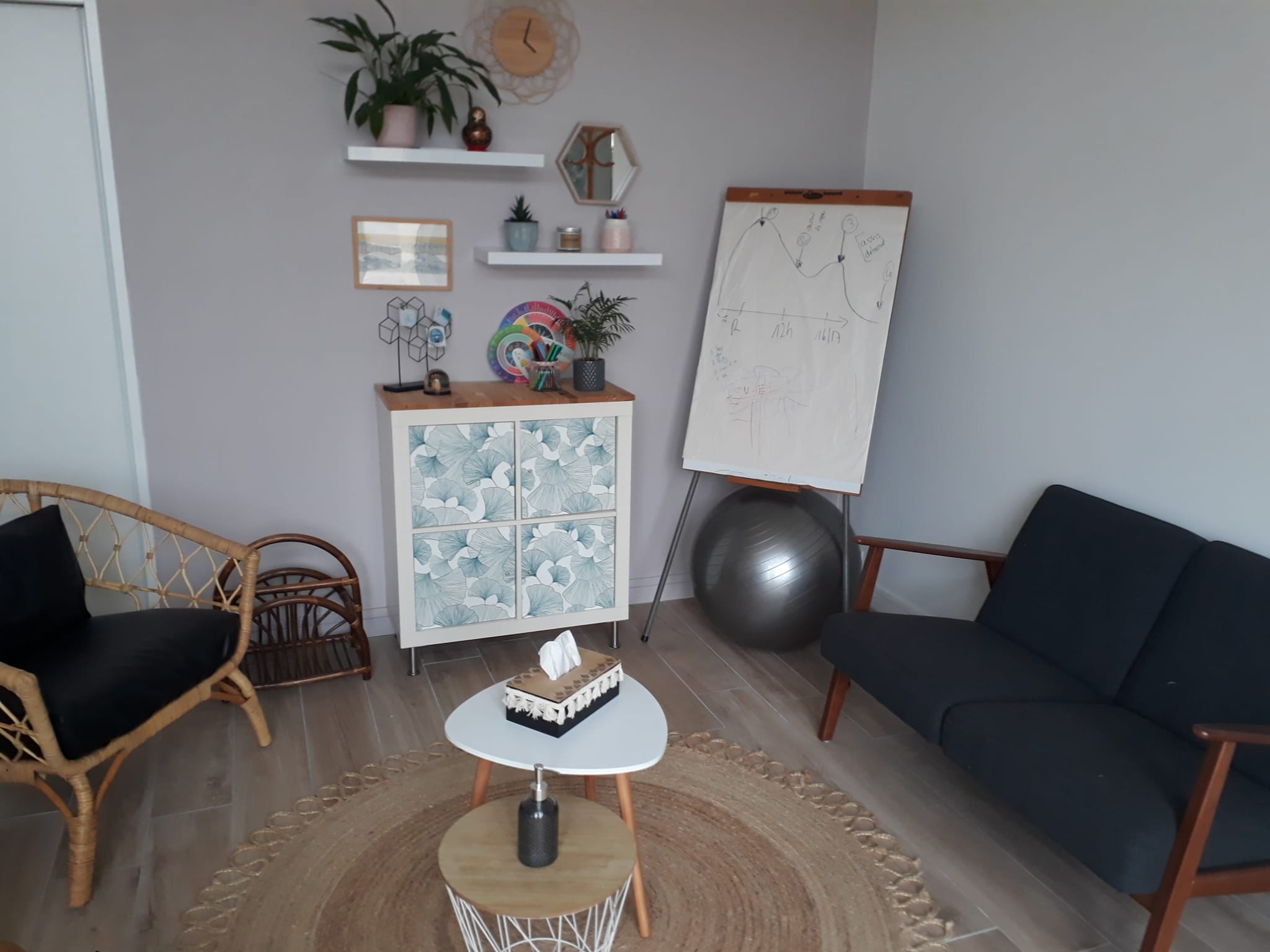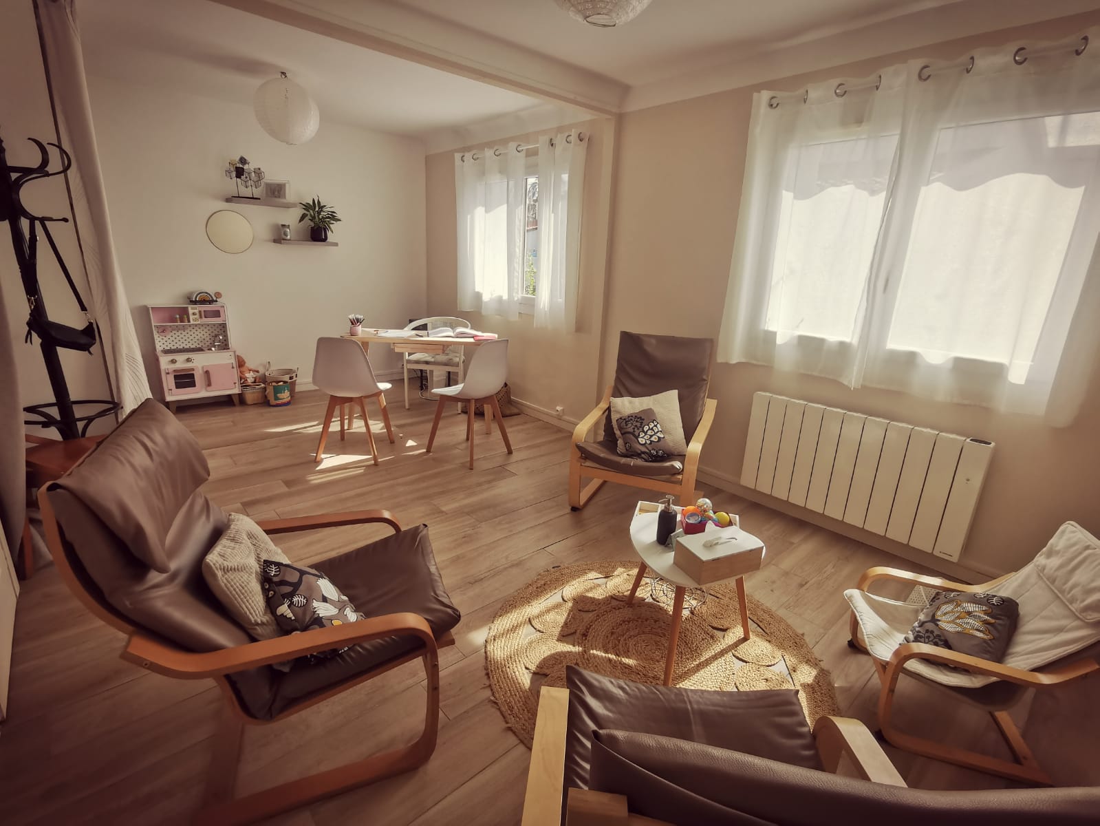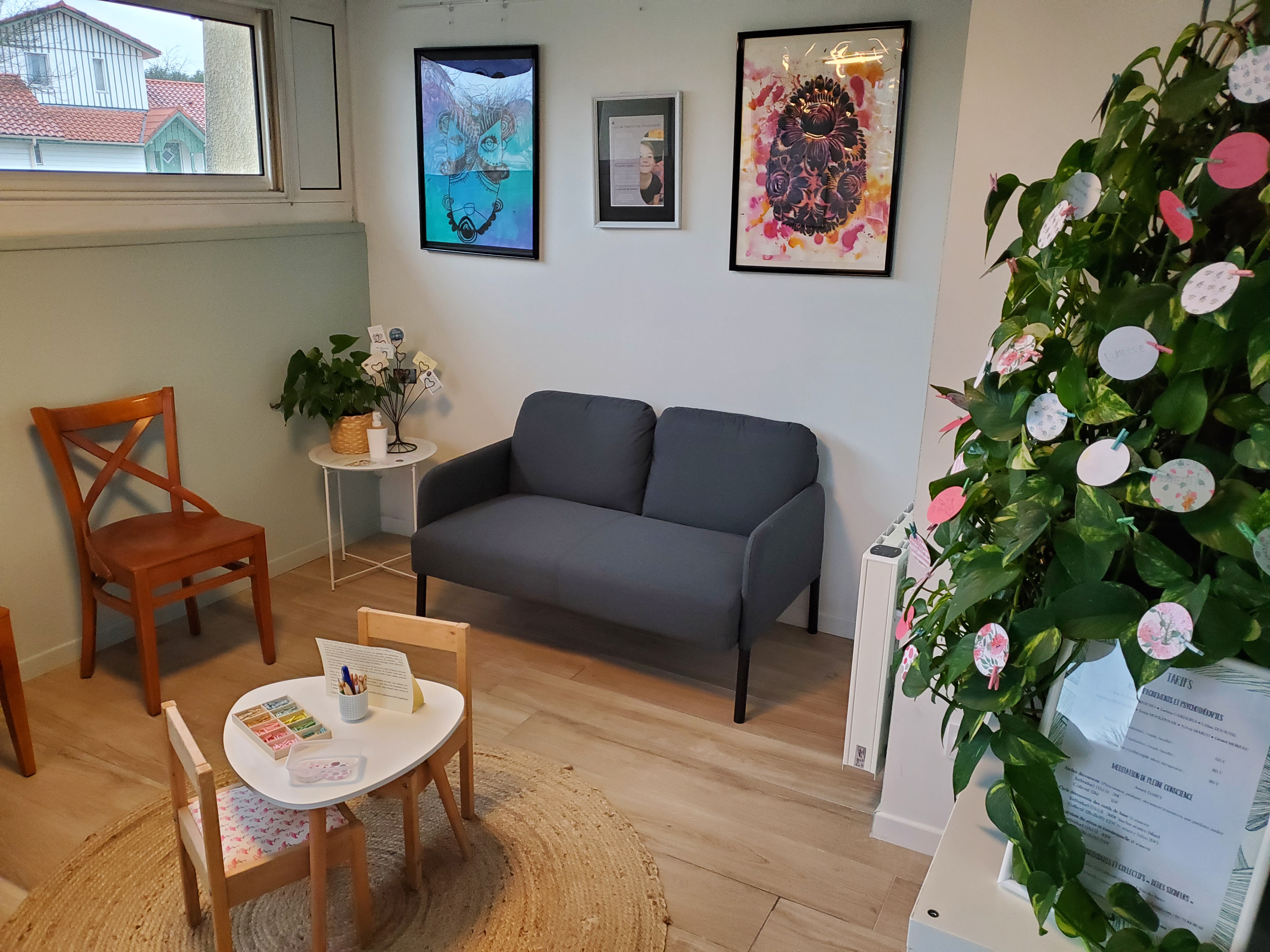 Le cabinet dispose aussi d’une grande salle pouvant accueillir des groupes et des formations. Je propose et anime actuellement des groupes de parole, des temps d’analyse des pratiques professionnelles et supervisions, des ateliers pour découvrir la cohérence cardiaque ainsi que des ateliers familiaux et des formations à la communication enrichie par des signes associés à la parole.